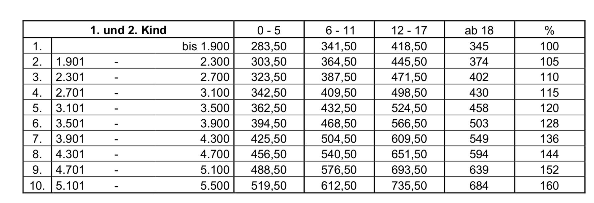 Wichtig: Die Tabelle hat keine Gesetzeskraft, sondern stellt eine Richtlinie dar. Sie ist nur ein Hilfsmittel, das Raum für eigene Beurteilungen und Angemessenheitskontrolle hat. Das wird in der aussergerichtlichen Praxis oft nicht wichtig genug genommen. Insbesondere stösst die Trennung von Bar- und Betreuungsunterhalt in Familien mit erweitertem Umgang oder gar im Wechselmodell an ihre Grenzen. Die Tabelle weist den monatlichen Unterhaltsbedarf aus, bezogen auf zwei Unterhaltsberechtigte, ohne Rücksicht auf den Rang. Der Bedarf ist nicht identisch mit dem Zahlbetrag; dieser ergibt sich unter Berücksichtigung der Anmerkungen und nach Abzug der Kindergeldhälfte. Weiter unten ist die "Zahlbetragstabelle".