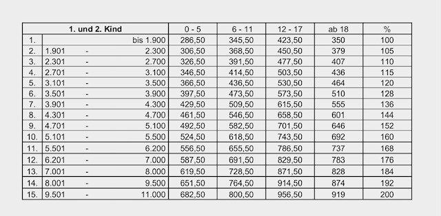 - für Kinder der dritten Altersstufe (vom 13. Lebensjahr bis zur Volljährigkeit) 533 EUR (Anhebung um 5 EUR).