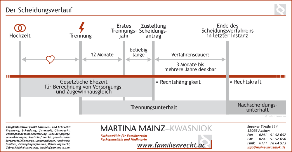 | Unterhalt nach der Trennung | Anspruch auf Trennungsunterhalt (§ 1361 BGB) bis zur Rechtskraft der Scheidung, keine weitere Voraussetzung als Einkommensunterschied („eheliche Lebensverhältnisse“) Nicht vertraglich verzichtbar Höhe: Halbteilungsgrundsatz / eheliche Lebensverhältnisse Dauer: 15 Monate bis mehrere Jahre, siehe Grafik unten | Kein gesetzlicher Anspruch auf Trennungsunterhalt – vertraglich regelbar Betreuungsunterhalt für den überwiegend betreuenden Elternteil (bei Kind unter 3 Jahren, § 1615l BGB) – das ist grundsätzlich auf das Residenzmodell ausgerichtet, also die überwiegende Betreuung eines Elternteils (51% ist überwiegend) Mehr (nicht weniger) ist per Vertrag möglich. Keine „ehelichen Lebensverhältnisse“ sondern „Schadenersatz“ für konkret entgehende Erwerbseinkünfte (das kann also weniger sein als der Trennungsunterhalt) | nein, aber vertragliche Regelung möglich |
